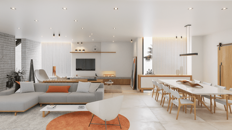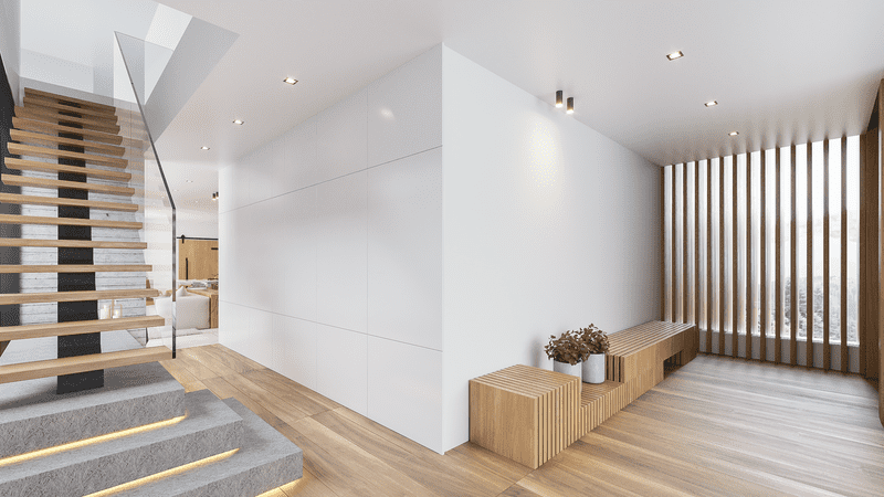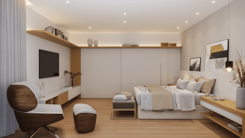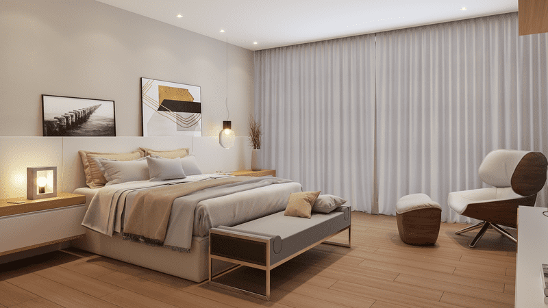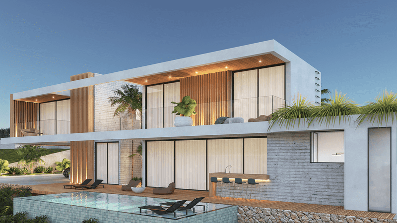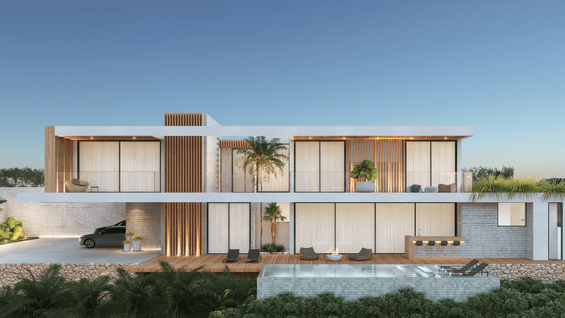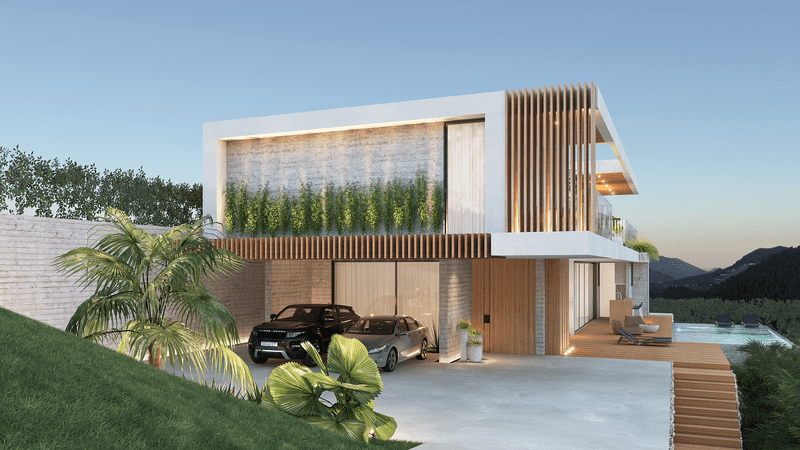 Nesse projeto, a arquitetura é conectada com os volumes da fachada de cheios e vazios que trazem contemporaneidade no conceito do projeto tanto na frente como nos fundos, privilegiando a privacidade dos moradores e valorizando a vista espetacular do terreno. Nesta arquitetura, os elementos internos como escadas, divisórias, portas e varandas não são apenas elementos mas obras de artes que integram o espaço arquitetônico de forma harmônica, ousada e elegante.